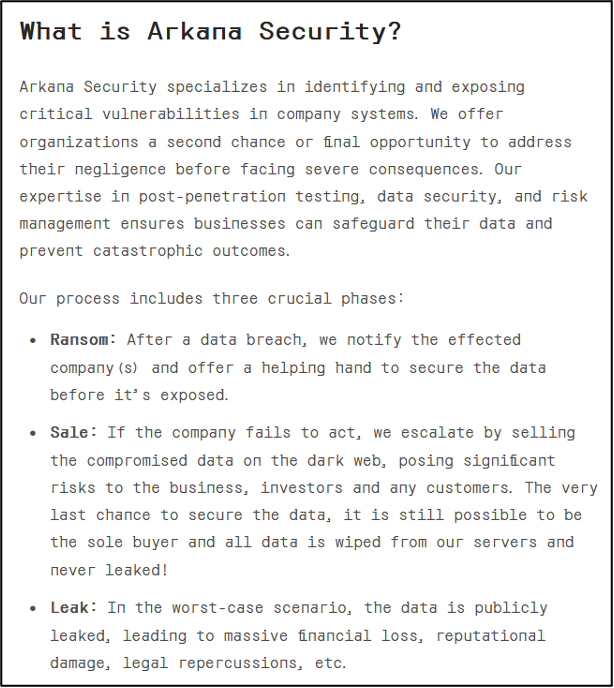 Aside from the victim blog, which currently only lists details from WOW!, ArkanaSecurity's DLS also has a section titled "About & Contact". This section describes at least part of the group's methodology, including a three-phase process it follows.
