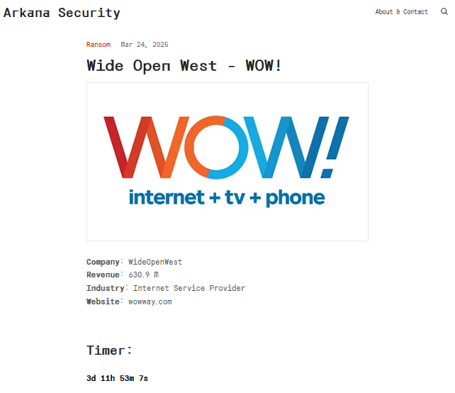ArkanaSecurity has publicly claimed attacks against one organisation, namely telecommunications company WideOpenWest (WOW!). This organisation was listed on the group's DLS on 24 March 2025. WOW! Is the eighth largest cable operator in the US, providing telephone, television, and broadband services to over 1.9 million households and businesses in the country. There is a countdown timer linked to the victim post, which is currently set to expire on 29 March 2025.